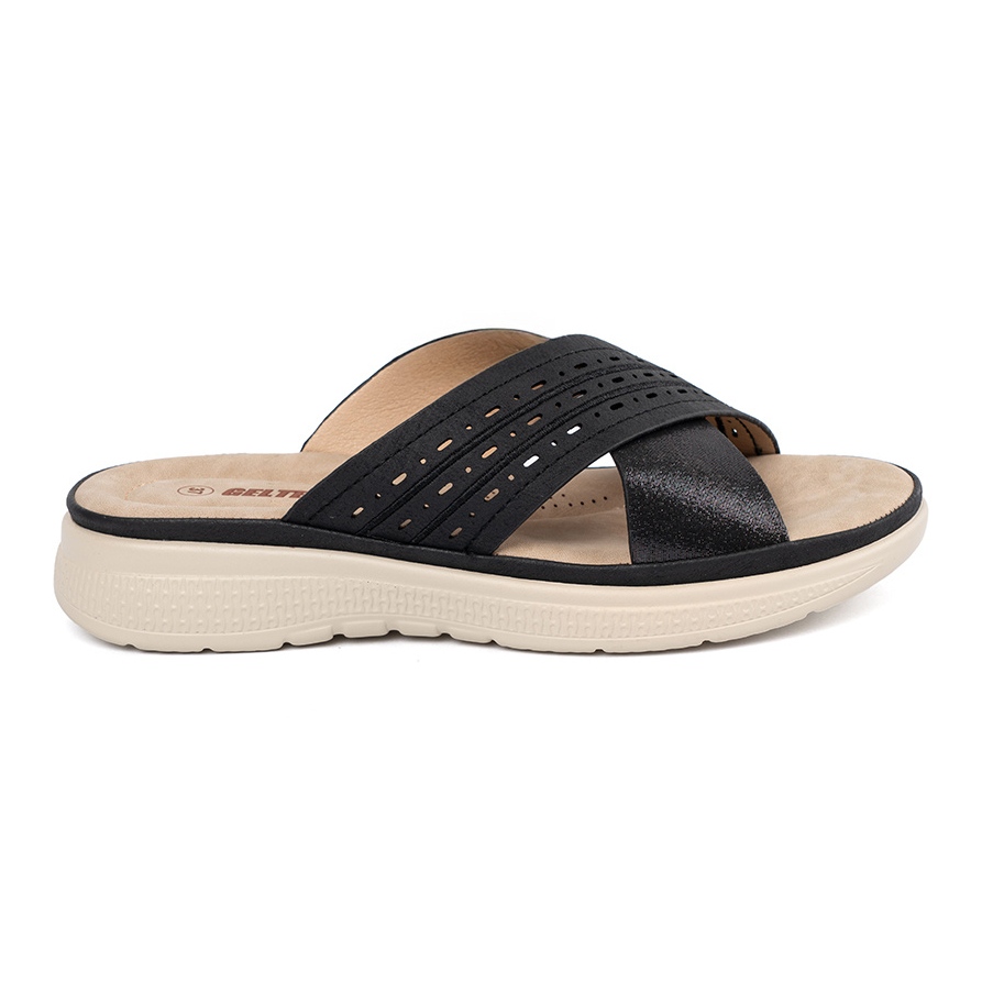 Entdecken Sie Eleganz und Komfort mit schwarzen Klappen auf der Plattform, die modisches Design perfekt kombinieren. Sie bestehen aus hochwertigem ökologischem Leder und bieten ein offenes Muster, das ihnen Leichtigkeit und Frische verleiht. Dank der offenen Befestigung und des Slip -Inchs sind sie äußerst praktisch und leicht zu verbringen, was sie zu einer guten Wahl für Sommertage, Spaziergänge oder Entspannung zu Hause macht.