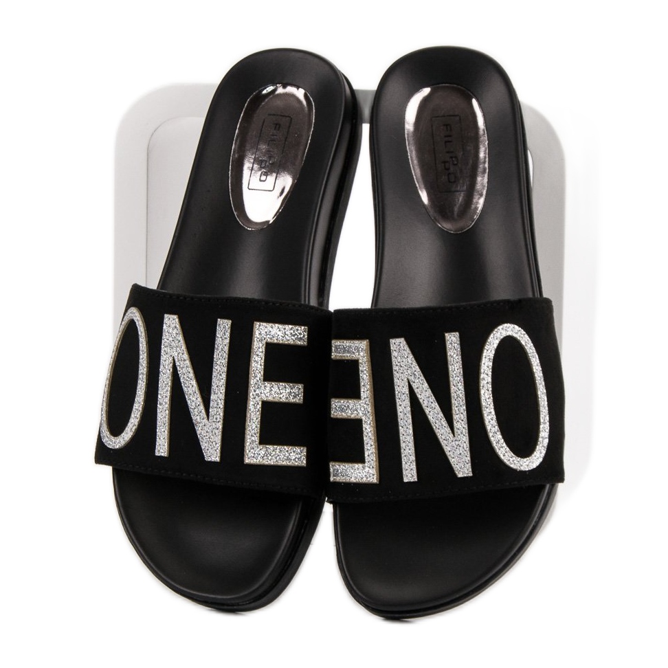 Filippo Czarne Klapki One ist die perfekte Wahl für jede Frau, die bequeme und stilvolle zehenstegsandalen für den Alltag sucht. Mit ihrer klassischen schwarzen Farbe und dem markanten Schriftzug peppen diese zehenstegsandalen jedes Outfit auf und verleihen ihnen einen modernen Touch.