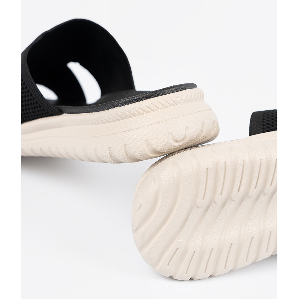 Schwarze Flip -Flops mischen sich perfekt mit einer Vielzahl von Stylisationen ein. Sie können sie leicht sowohl mit lässigen Hosen als auch mit luftigen Kleidern kombinieren, und die beige Sohle wird die gesamte Figur auf subtile Weise betonen.