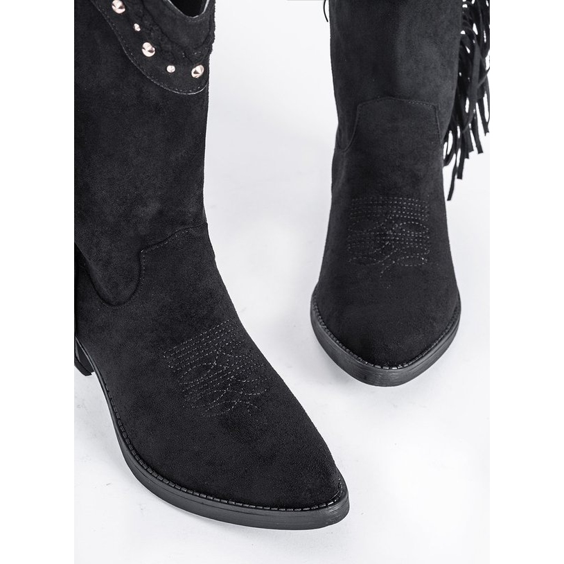 Entdecken Sie den neuesten Hit der Saison – schwarze hohe Cowboystiefel mit Clover-Strasssteinen! Diese äußerst stylischen Schuhe sind eine Kombination aus Eleganz und Lässigkeit, die perfekt zu Frühlings- und Herbsttrends passt. Mit Fransen und spektakulären goldenen Strasssteinen verziert, ziehen sie die Blicke auf sich und unterstreichen den individuellen Stil jeder Frau.
