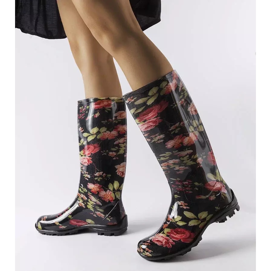 Schwarze hohe Stiefel mit Pimen-Rosen – eine Kombination aus Eleganz und Schutz vor Regen