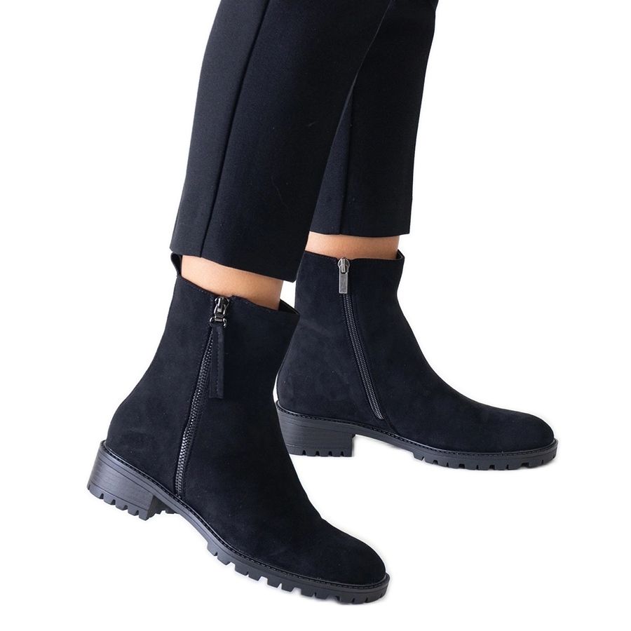 Die 4 cm hohe Plattform und eine flache Ferse aus nicht schlechter Gummi erhöhen die Stabilität, was sie täglich zu einem idealen Modell macht. Dank der Zipper -Befestigung, dem Anziehen und Ausziehen von Stiefeln ist es schnell und komfortabel. Die Höhe der Schuhe, die den Knöchel erreichen, schützt perfekt vor niedrigeren Temperaturen, und die klassische schwarze Farbe macht sie äußerst vielseitig - sie sind leicht mit unterschiedlichen Stilen zu kombinieren.