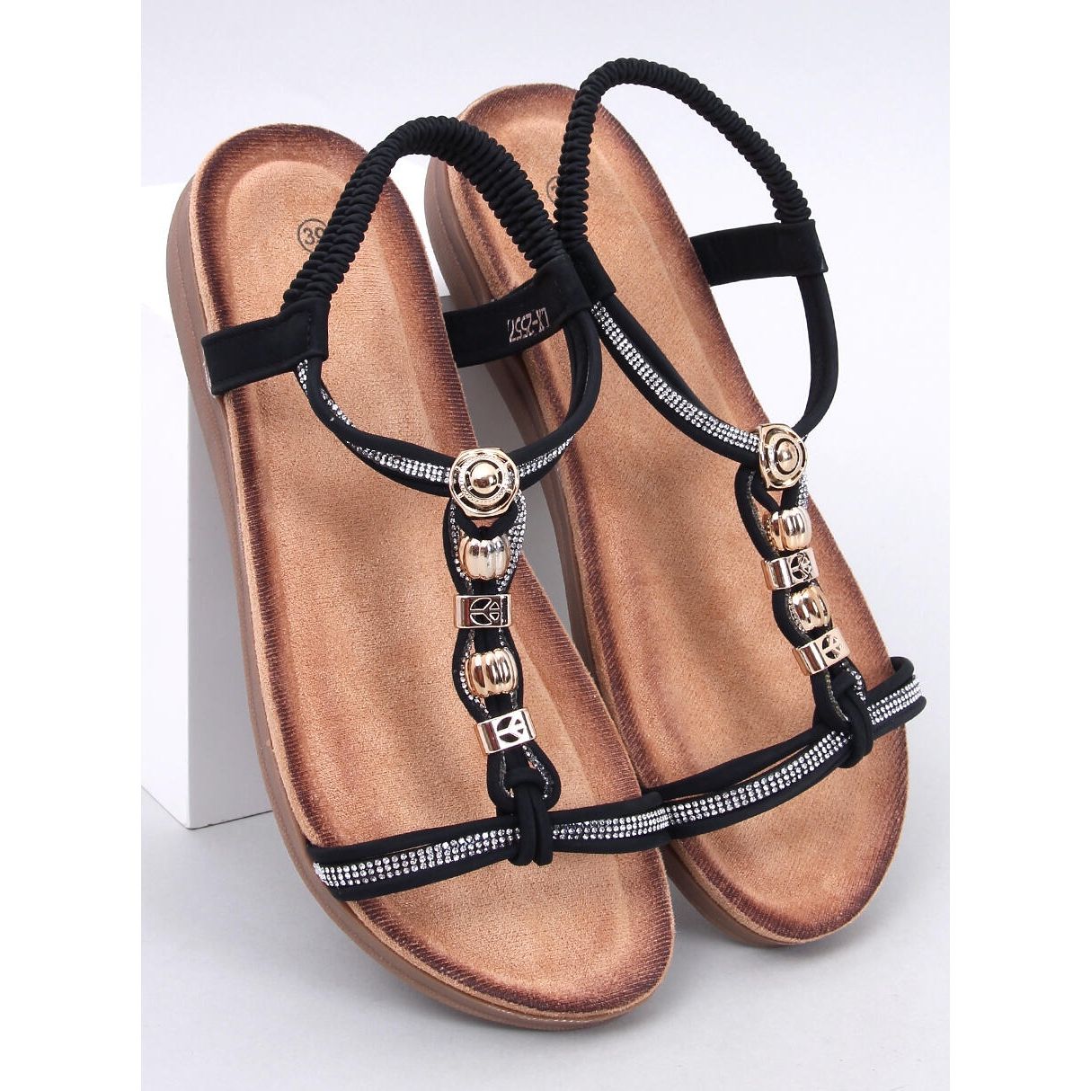 Treffen Sie die Sandalen, die mit Isabey Black Zircons verziert sind - die perfekte Wahl für Frauen, die jeden Tag Eleganz mit Komfort kombinieren möchten. Diese schwarzen Sandalen auf einer dicken Sohle zeichnen sich dank goldener Details und glänzenden Zirkons durch einen einzigartigen Stil aus, die ihnen einen einzigartigen Glanz verleihen. Dies ist eine hervorragende Option für diejenigen, die sich keine Sorgen um Accessoires machen möchten, da diese Sandalen für sich selbst eine ausdrucksstarke Dekoration sind!