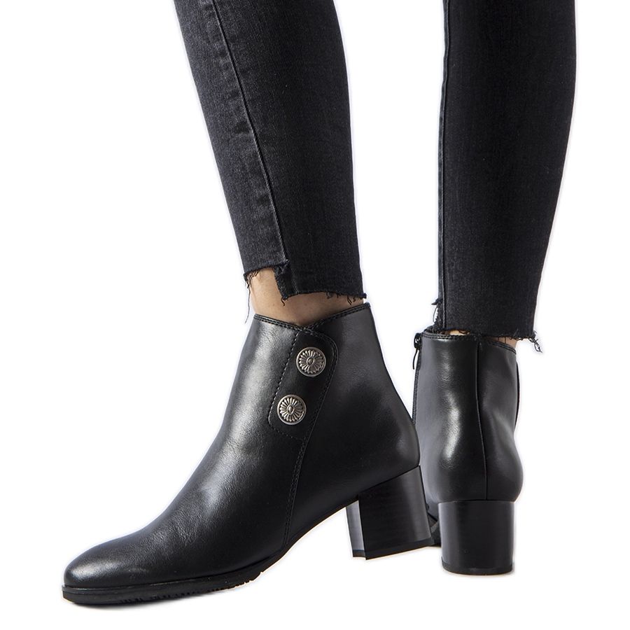 Elegante, universelle Frauenstiefel ideal für die Herbst -Winter -Saison. Hergestellt aus ökologischem Leder in einer klassischen schwarzen Farbe, im Inneren, Mandelzeh und einem komfortablen, niedrigen Pfosten.