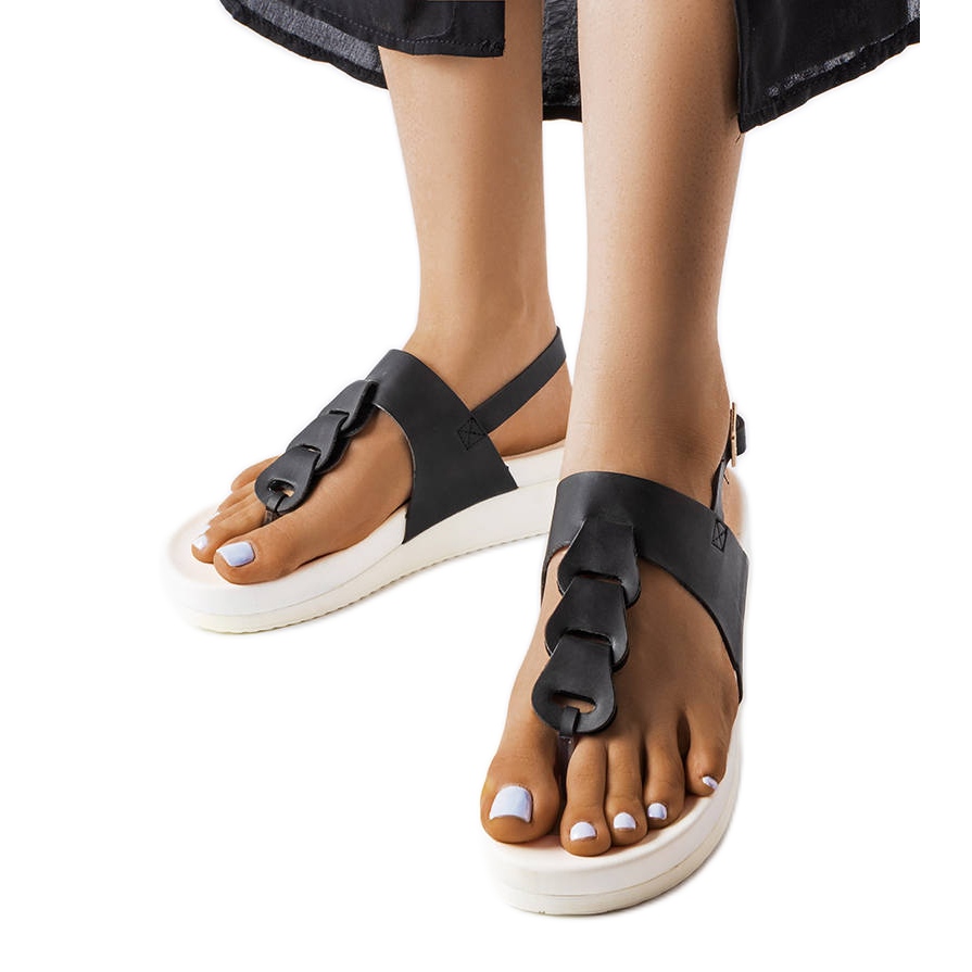 Elegante Frauenflip -Flip -Flops auf einem stabilen Keil mit einer Höhe von 4,5 cm. Das klassische Schwarz des oberen ökologischen Leders kombiniert mit einer kontrastierenden weißen Gummi -Sohle - einem effektiven und universellen Look, der sowohl alltägliche als auch elegante Sommerstilisationen entspricht.