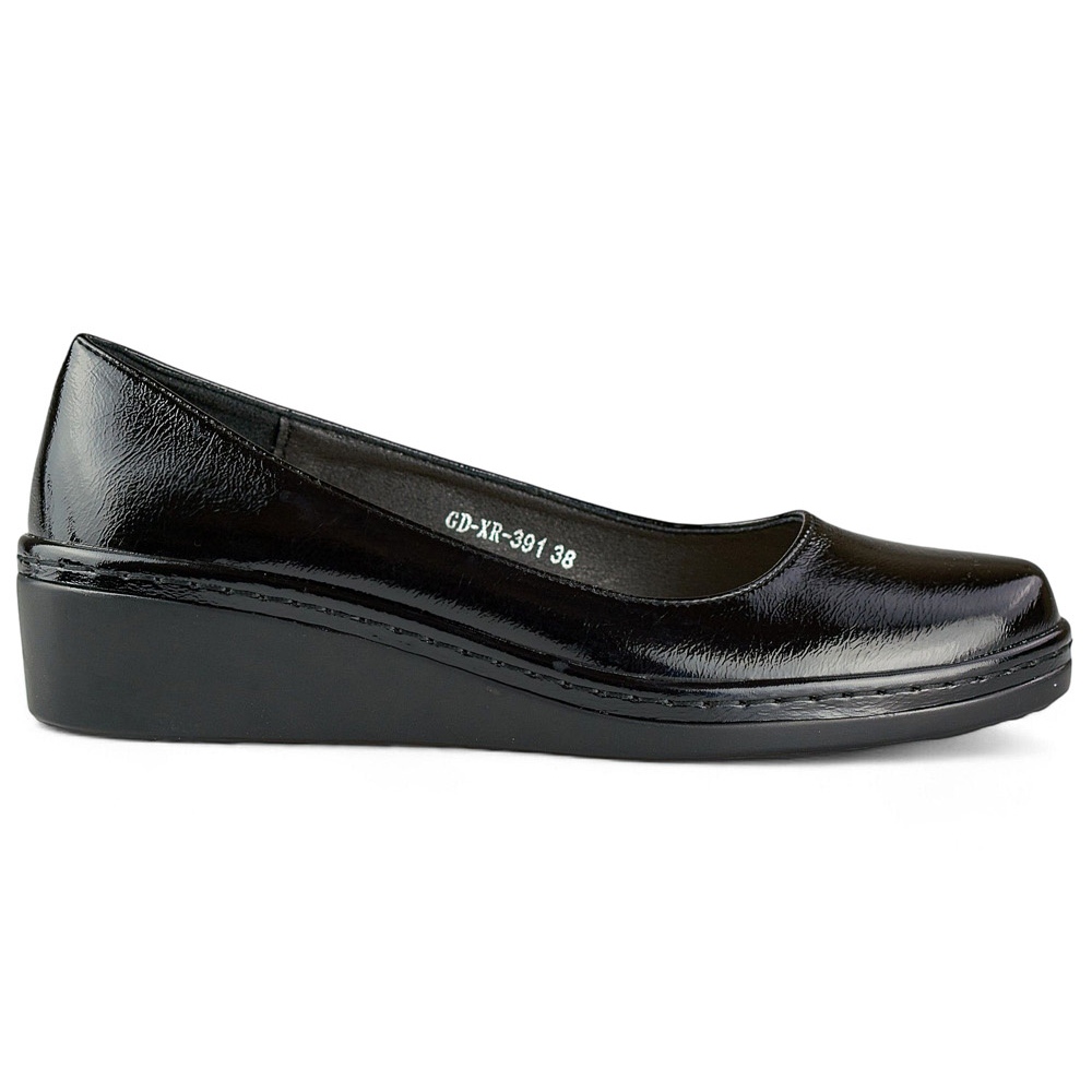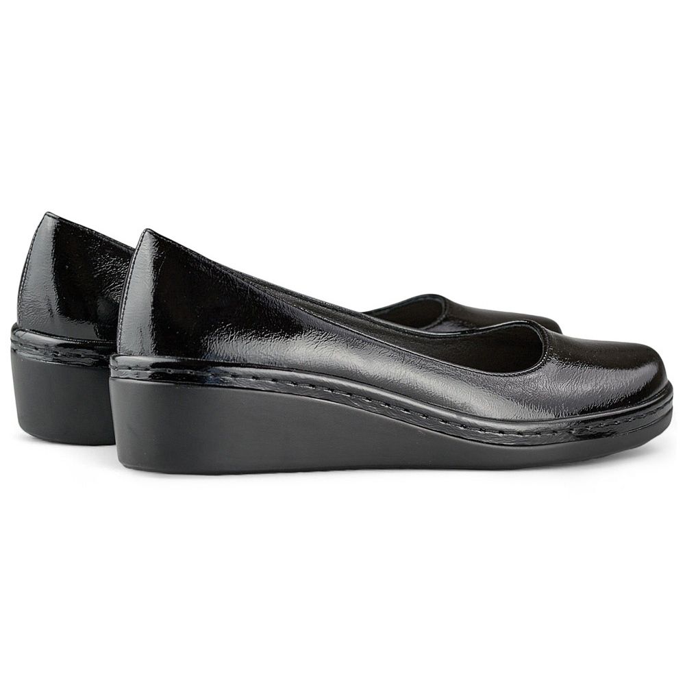 Entdecken Sie Eleganz und Komfort mit lackierten schwarzen Pumpen mit niedrigen Wedges von Frauen. Diese einzigartigen Schuhe kombinieren modisches Design und Praktikabilität, was sie zu einer idealen Wahl für eine moderne Frau macht. Sie bestehen aus hochwertigem ökologischem, lackiertem Leder. Sie sehen extrem stilvoll aus und verleihen jedem Styling Pracht.