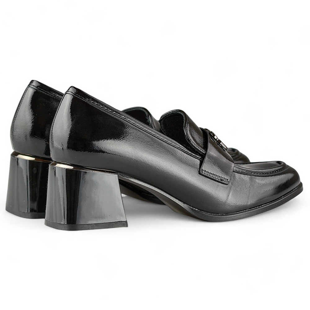 Details: Schwarze Lackschuhe mit niedrigem Absatz, Damenpumps mit hohem Absatz
