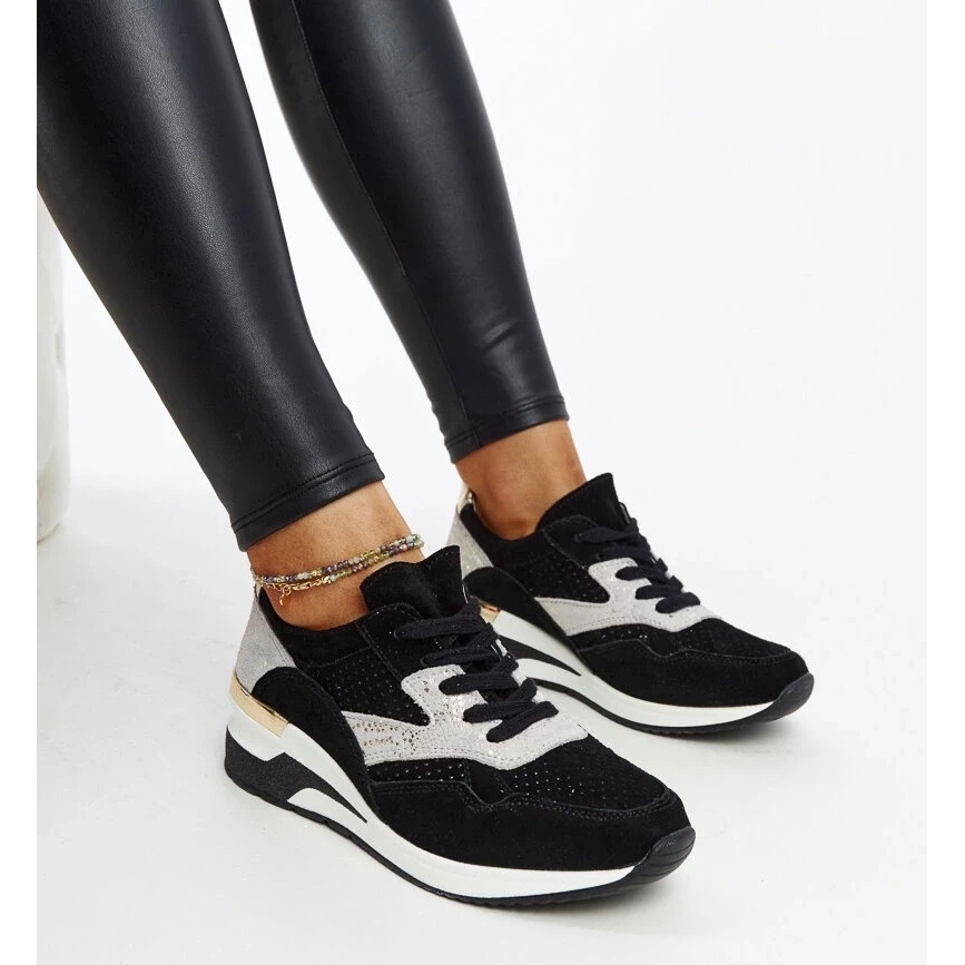 Die Keilhöhe von 11,5 cm ermöglicht eine komfortable Erhöhung der Figur, ohne den Komfort von Sportschuhen aufzugeben. Manfrin -Turnschuhe sind in einer eleganten schwarzen Farbe erhältlich, die perfekt zu verschiedenen Stilisationen passt.