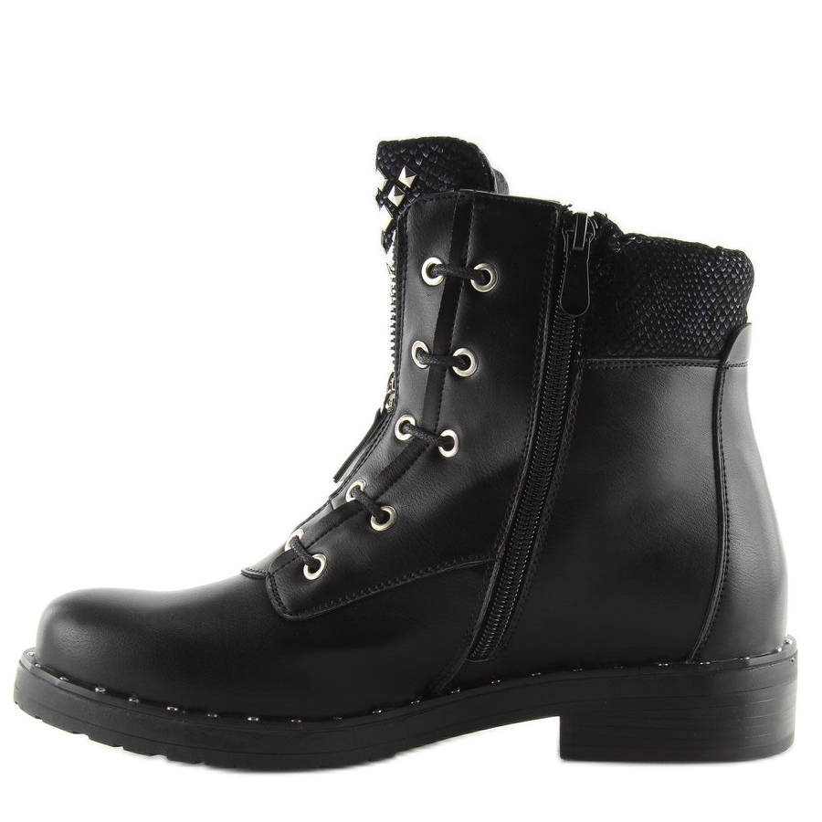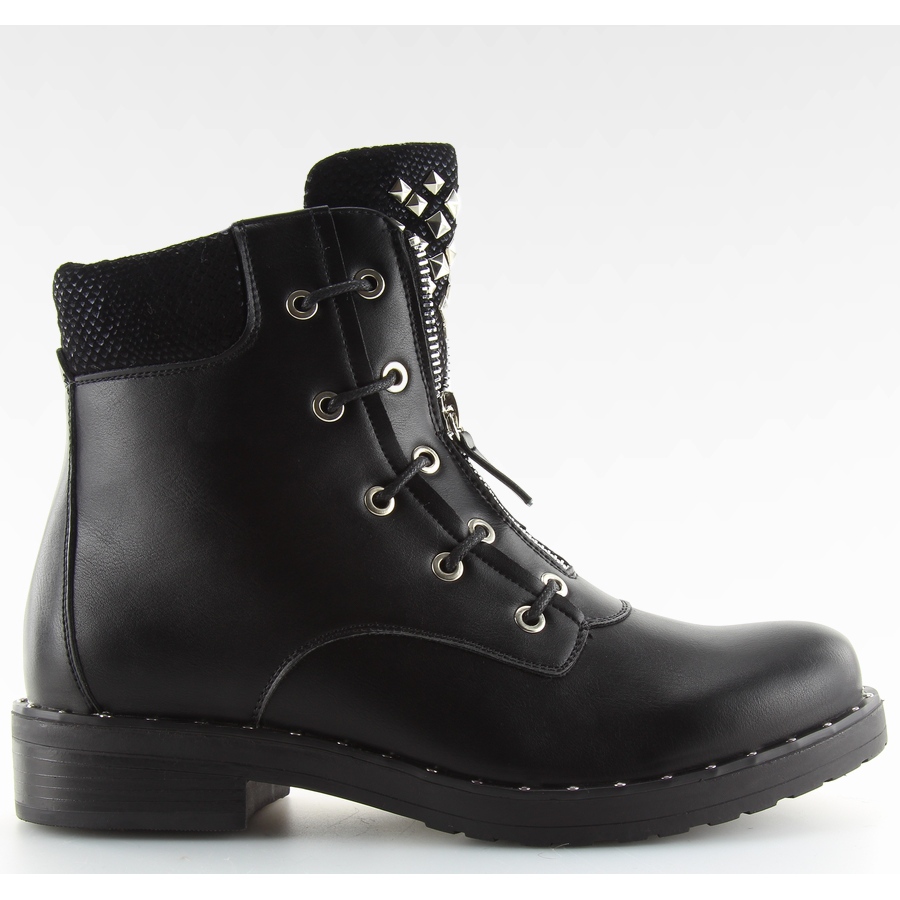 Entdecken Sie einen einzigartigen Stil mit den schwarzen Militärstiefeln BH82-KB schwarz! Diese einzigartigen Damen-Flachstiefel im Grunge-Stil sind ein Must-Have für jede modebewusste Frau. Ihr markantes Zierelement ist eine mit Nieten besetzte Zunge, die für einen rockigen Charakter sorgt, und ein silberner Reißverschluss, der ihnen einen modernen Look verleiht.