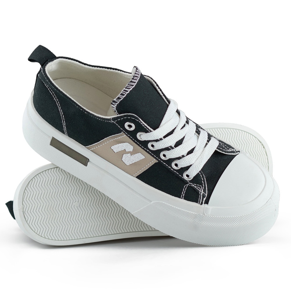Wir präsentieren stilvolle schwarze Frauen -Turnschuhe, die sich dank ihrer dicken Plattform von anderen Modellen abheben. Diese niedrigen Turnschuhe aus hochwertigem Stoff kombinieren Komfort mit modischem Design. Die runde Nase bietet Freiheit der Bewegung, und die klassische schwarze Farbe macht sie zu vielen Stilen - von lässiger bis hin zu eleganter.