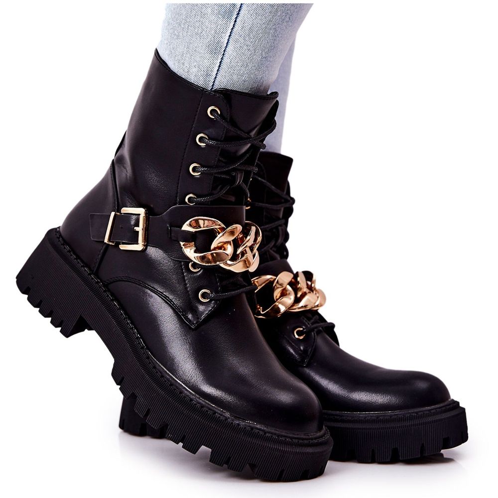 Details: WS1 Schwarze Molisa Worker-Stiefel mit Kette golden