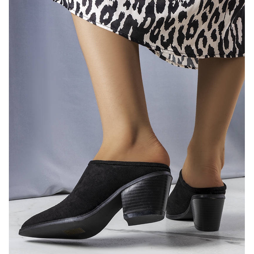 Details: Schwarze Pantoletten mit aufgebauter Vorderseite von Linda
