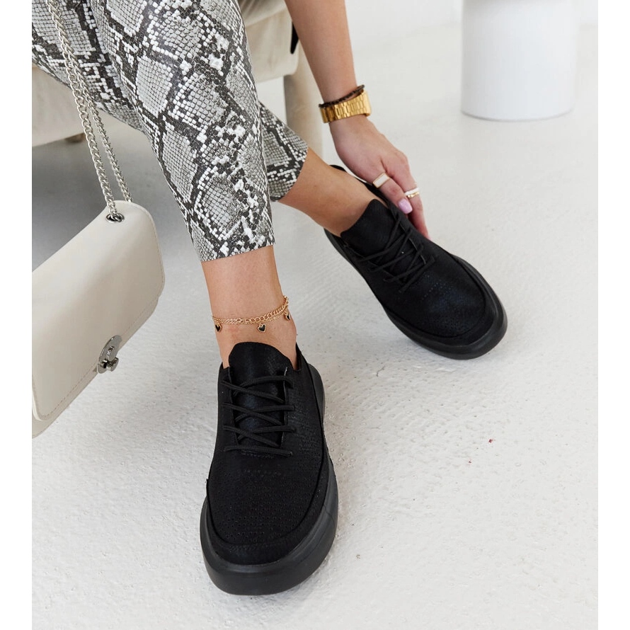 Entdecken Sie ungewöhnliche schwarze Turnschuhe auf der Lori -Plattform, die ein modernes Design mit außergewöhnlichem Komfort kombinieren. Dank des metallischen Finish erhalten diese Schuhe einen einzigartigen, modischen Charakter, der perfekt zu den neuesten Trends passt. Openwork -Details geben ihnen nicht nur Leichtigkeit, sondern passieren auch die Luft, was sie zu einer großartigen Wahl für heiße Sommertage macht.