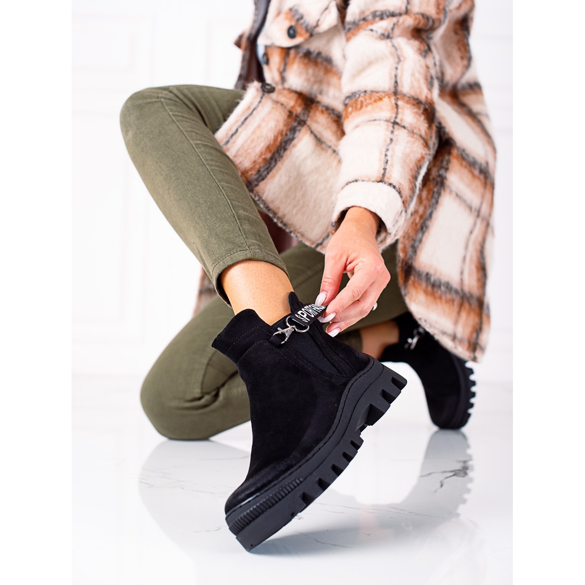Entdecken Sie außergewöhnlichen Komfort und Stil mit Potocki-Arbeitern aus schwarzem Wildleder, geschaffen für moderne Frauen, die Wert auf Mode und Komfort legen. Diese eleganten Stiefeletten passen perfekt zum Casual- und Rock-Stil und sind somit eine perfekte Alltagswahl an kälteren Herbst- und Wintertagen.