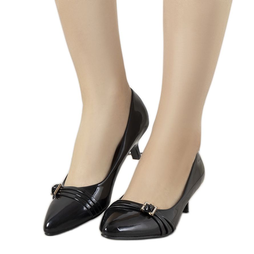 Die schwarzen Pumps mit niedrigem Absatz von Majora sind die perfekte Wahl für Frauen, die Wert auf Eleganz und Komfort legen. Diese klassischen Schuhe sind sorgfältig aus ökologischem Lackleder gefertigt, was ihnen einen außergewöhnlichen Glanz und ein stilvolles Aussehen verleiht. Eine zarte, mit Zirkonen verzierte Schnalle verleiht ihnen einen subtilen Charme und macht sie zu einer perfekten Ergänzung zu verschiedenen eleganten Stilen.