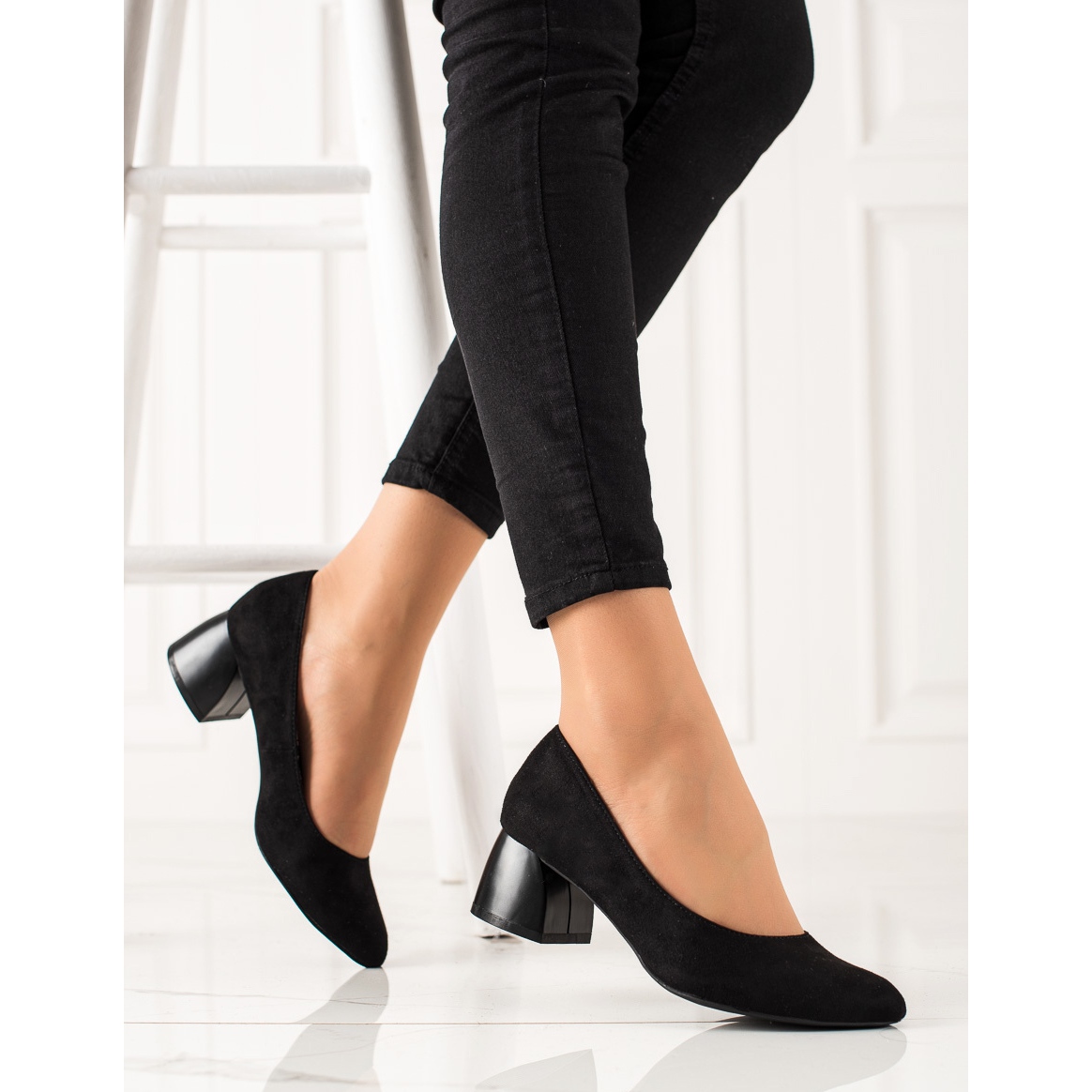 Schwarze Pumps mit niedrigem Absatz vom Hersteller M.Daszyński sind die perfekte Wahl für Frauen, die Wert auf Eleganz und Komfort legen. Diese klassischen Schuhe aus hochwertigem Faux-Wildleder mit Wildlederimitat eignen sich sowohl für Zeremonien als auch für Abendveranstaltungen. Dank der eingearbeiteten und versteiften Ferse garantieren die Pumps Stabilität und Tragekomfort.