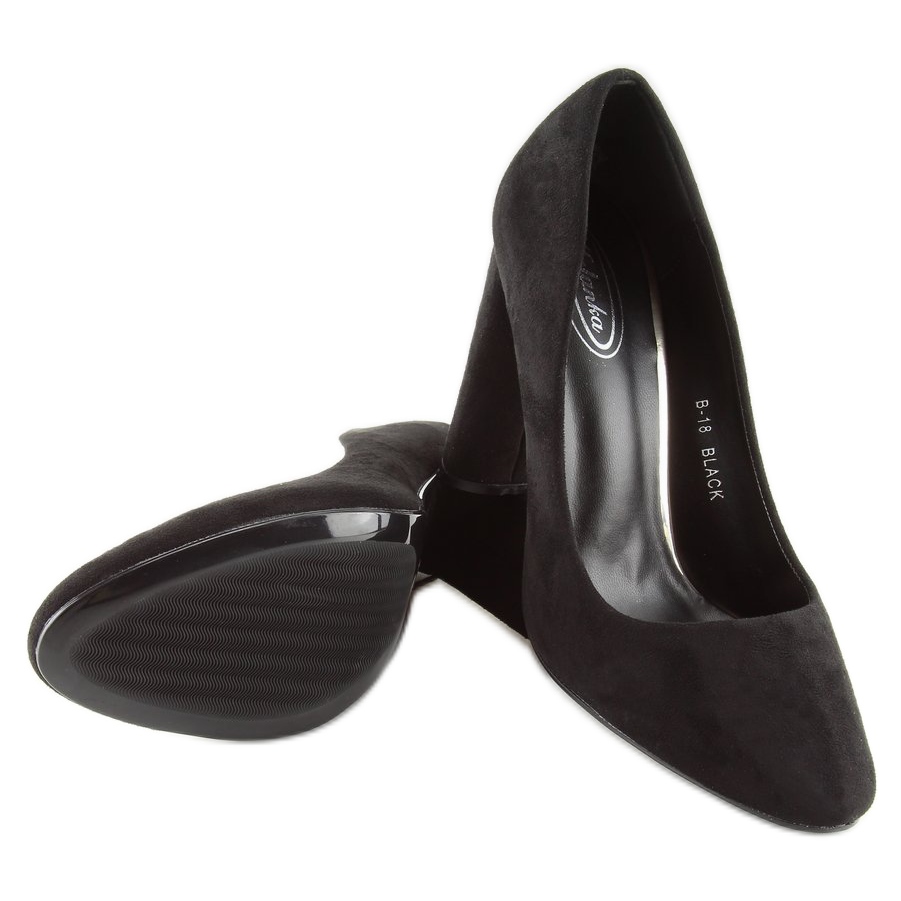 Die schwarzen Pumps B-18 mit hohen Absätzen sind eine ideale Wahl für Frauen, die sowohl Wert auf Eleganz als auch auf Komfort legen. Diese klassischen Schuhe aus ökologischem Wildleder zeichnen sich durch einen stabilen Absatz – einen 9,5 cm hohen Block – aus, was sie zu einer perfekten Wahl für jeden Anlass macht.