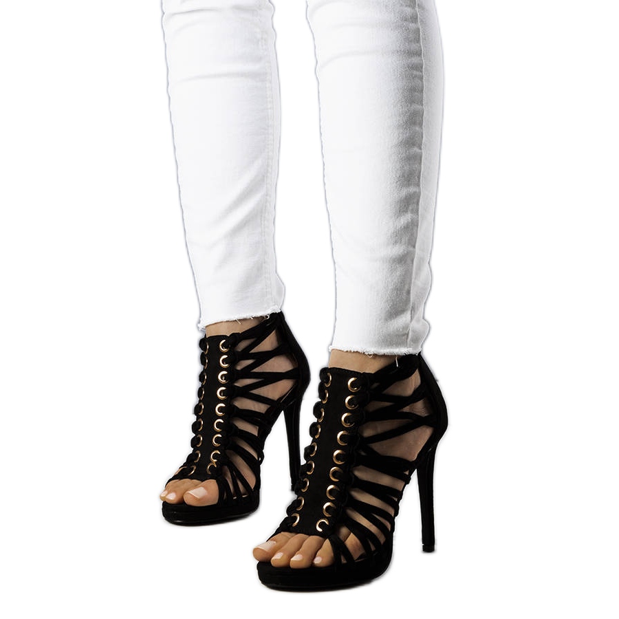 Elegante, weibliche und sinnliche - Pompis -Sandalen sind ein Vorschlag, der jeden Abend die Stilisierung ergänzt. Die klassischen, schlanken Stifte mit einer Höhe von 11,5 cm prägen die Figur wunderschön und die subtile Plattform und ein weicher Einsatz aus ökologischem Leder garantieren einen größeren Tragenkomfort. Das obere ökologische Leder aus Wildleder in einer klassischen schwarzen Farbe und offene Details von offenen Arbeiten verleiht Schuhen Leichtigkeit und Eleganz. Das Modell ist mit einem praktischen Schloss geschlossen, wodurch das Einrichten erleichtert wird.