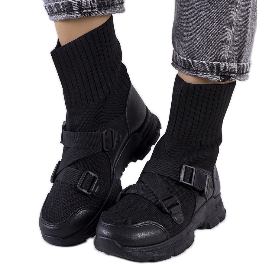Entdecken Sie eine neue Dimension des urbanen Stils mit schwarzen Saker-Sneakern, die Komfort mit modernem Design verbinden. Diese modischen Schuhe mit hohen Sohlen sind die perfekte Basis für ein Alltags-Styling, das mit Sicherheit die Blicke auf sich zieht. Das Obermaterial aus einer Kombination aus Textilmaterial und Faux-Wildleder reicht bis über den Knöchel, was nicht nur Originalität verleiht, sondern auch ausreichend Halt bietet. Der verstellbare Riemen ermöglicht eine individuelle Anpassung, was den Tragekomfort erhöht.