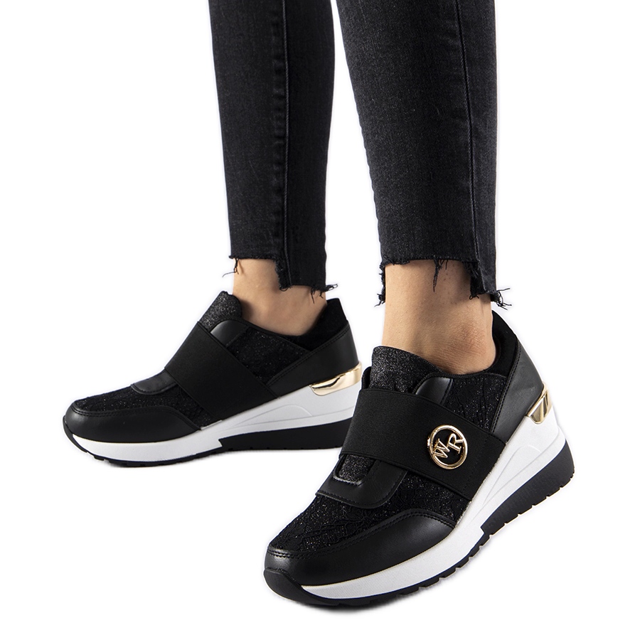 Black Sliding -Sneaker am Salida -Keil sind ein idealer Ansprechen für Frauen, die Stil mit Komfort kombinieren möchten. Dank ihres runden Nosk strahlen diese Schuhe Subtilität und Eleganz aus, was sie zu einer großartigen Wahl für alltägliche, lässige Kombinationen und formellere Stilisierungen macht.