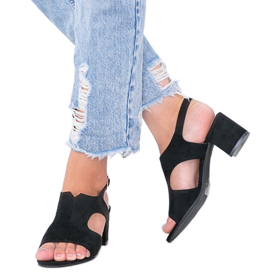 Die schwarzen Buenna-Sandalen mit niedrigem Absatz sind die perfekte Wahl für jede elegante Frau, die Komfort mit einem modischen Look verbinden möchte. Aus hochwertigem ökologischem Wildleder gefertigt, zeichnen sich diese Sandalen durch außergewöhnliche Liebe zum Detail aus. Der leicht aufgebaute Schaft mit interessanten Ausschnitten an den Seiten macht sie nicht nur schick, sondern macht den Fuß auch optisch schlanker, was sie perfekt für Sommerabende und lockere Meetings macht.
