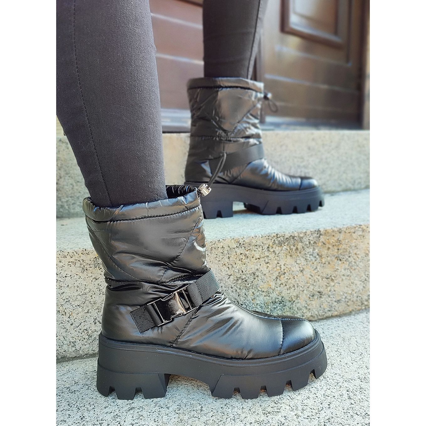 Universelle, schwarze Frauenschnee -Stiefel für kühlere Monate. Das textile Obermaterial und der Einsatz sowie zusätzliche Isolierung und Fell garantieren den thermischen Komfort sowie eine solide, schwarze Sohle und Plattform sorgen für Stabilität auf rutschigen Oberflächen. Perfekt für den täglichen Gebrauch in der Herbst/Wintersaison.