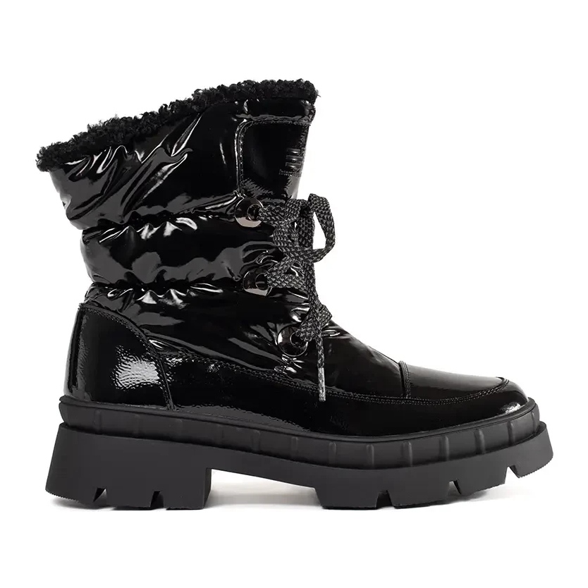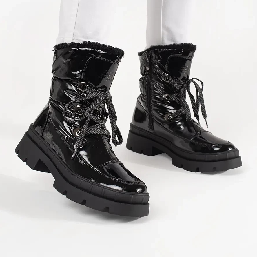 Schwarze Schneestiefel zeichnen sich durch einen flachen Absatz von 5 cm und eine Schafthöhe von 14 bis 15 cm aus, wodurch sie die Beine perfekt vor Kälte schützen. Dank der profilierten Kunststoffsohle bieten die Schuhe Stabilität und Traktion auf verschiedenen Untergründen.