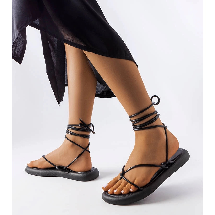 Schwarz gebundene Laurence -Sandalen - Licht, universelle und komfortable Frauensandalen ideal für den Sommer. Modell 260-20 kombiniert eine klassische, minimalistische Form von zehenstegsandalen mit dekorativen Schnürung, die ihnen einen modernen Charakter verleiht. Schwarze Farbe und glatte Oberfläche ohne Muster lassen sie sowohl alltägliche als auch elegantere Stilisierungen passen.