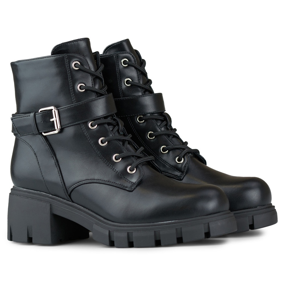 Schwarze Spitzen -UP -Stiefel von Eco -Leder mit niedrigen Absätzen -ein Klassiker in einer modernen Ausgabe. Stylische, universelle und komfortable Schuhe, die in der Herbst/Winter -Saison in alltäglichen und eleganteren Stylisationen arbeiten. Perfekt für die Arbeit, zum Spaziergang und für ein Treffen mit Freunden.