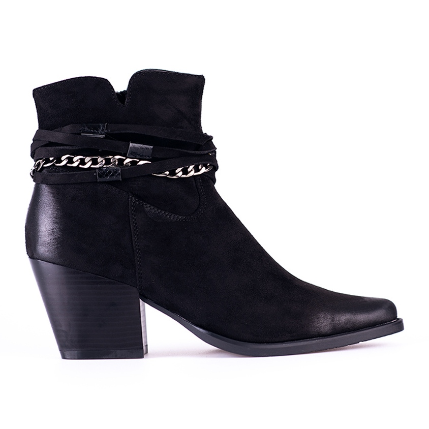 Tragen Sie diese Stiefeletten sowohl für alltägliche Anlässe als auch für besondere Momente. Die elegante schwarze Farbe und die dekorative Kette, die ein originelles Designelement darstellt, sorgen für ein schönes Erscheinungsbild. Die Absatzhöhe beträgt angenehme 7 cm – eine perfekte Lösung, um Ästhetik mit Komfort zu verbinden.