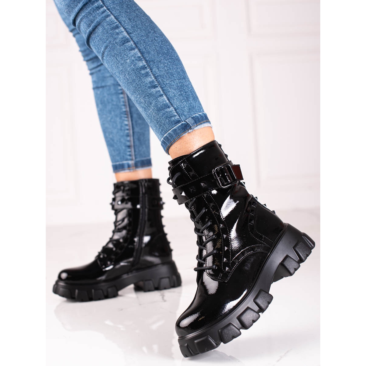 Die lackierte Arbeitertasche für Damen von Shelovet ist eine ausgezeichnete Wahl für Frauen, die nicht nur Wert auf Stil, sondern auch auf Komfort legen. Diese schwarzen Stiefeletten vereinen einen lässigen und rockigen Charakter und eignen sich daher perfekt für alltägliche Ausflüge in der Herbst-/Wintersaison.