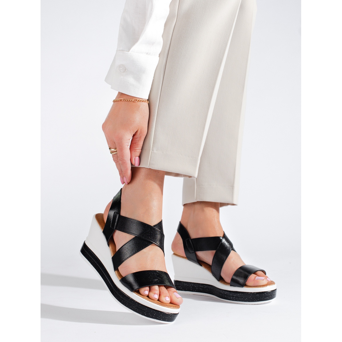 Ein Keilabsatz mit einer Höhe von 5 bis 8 Zentimetern ist eine ideale Lösung für Menschen, die einen stabilen und bequemen Absatz suchen. Es ermöglicht Ihnen, Ihre Figur zu betonen, ohne Ihre Bewegungsfreiheit einzuschränken. Die Schuhe sind mit einer eleganten Schnalle ausgestattet, die nicht nur Charme verleiht, sondern auch dafür sorgt, dass sich die Sandalen perfekt an den Fuß anpassen.
