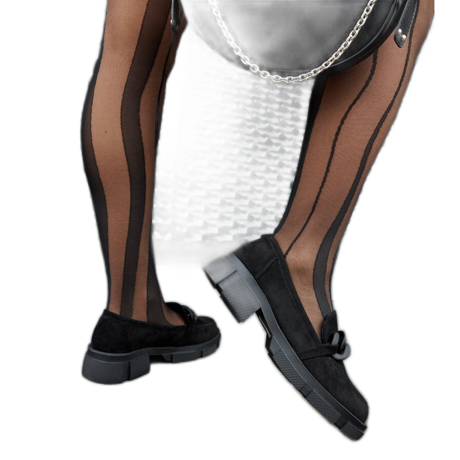 Schwarze Slipper mit Kette aus Öko-Wildleder sind die perfekte Wahl für moderne Frauen, die Komfort mit Eleganz verbinden möchten. Aus ökologischem Wildleder gefertigt, sehen diese stylischen Schuhe äußerst beeindruckend aus und passen durch ihre klassische schwarze Farbe zu vielen Sommer-Styles. Das mit einer dezenten Kette verzierte Modell GD-XR-119C zieht die Blicke auf sich und verleiht sowohl alltäglichen als auch formelleren Outfits Charakter.