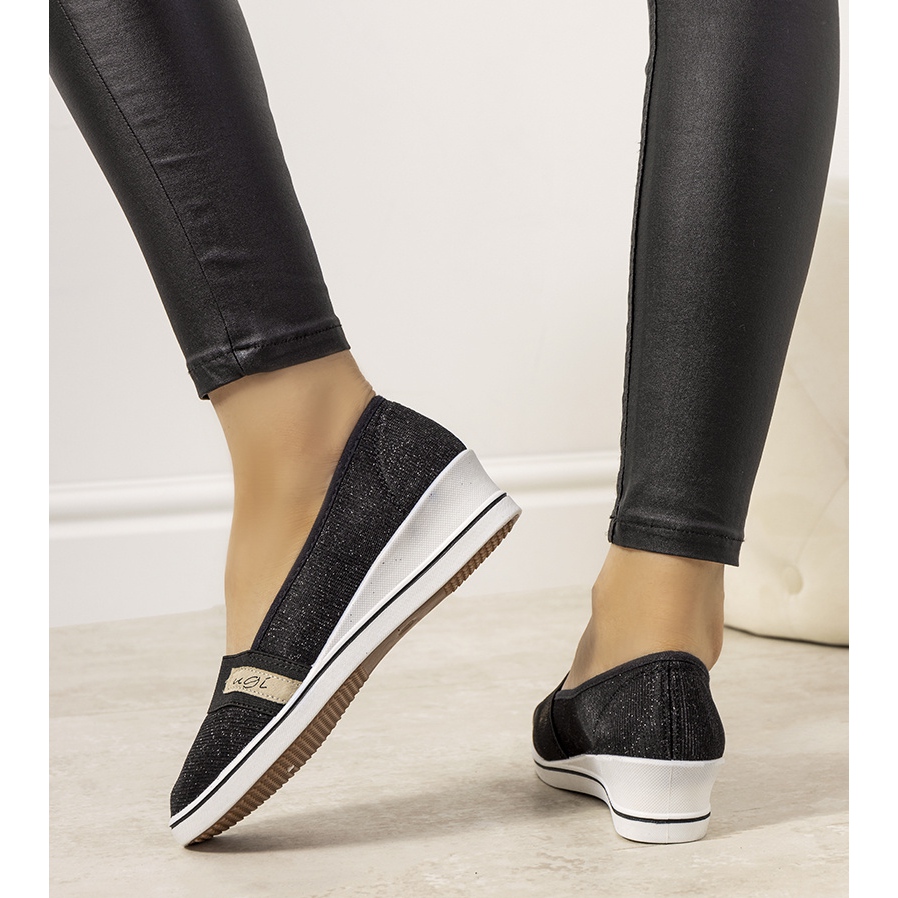 Niedrige Keilabsätze, 4 cm hoch, aus weicher Gummisohle sorgen für Stabilität und Tragekomfort, ohne die Füße zu belasten. Das mit Glanzfäden veredelte Obermaterial aus Stoff verleiht den Schuhen ein elegantes Aussehen und der elastische Einsatz sorgt für eine perfekte Passform am Fuß.
