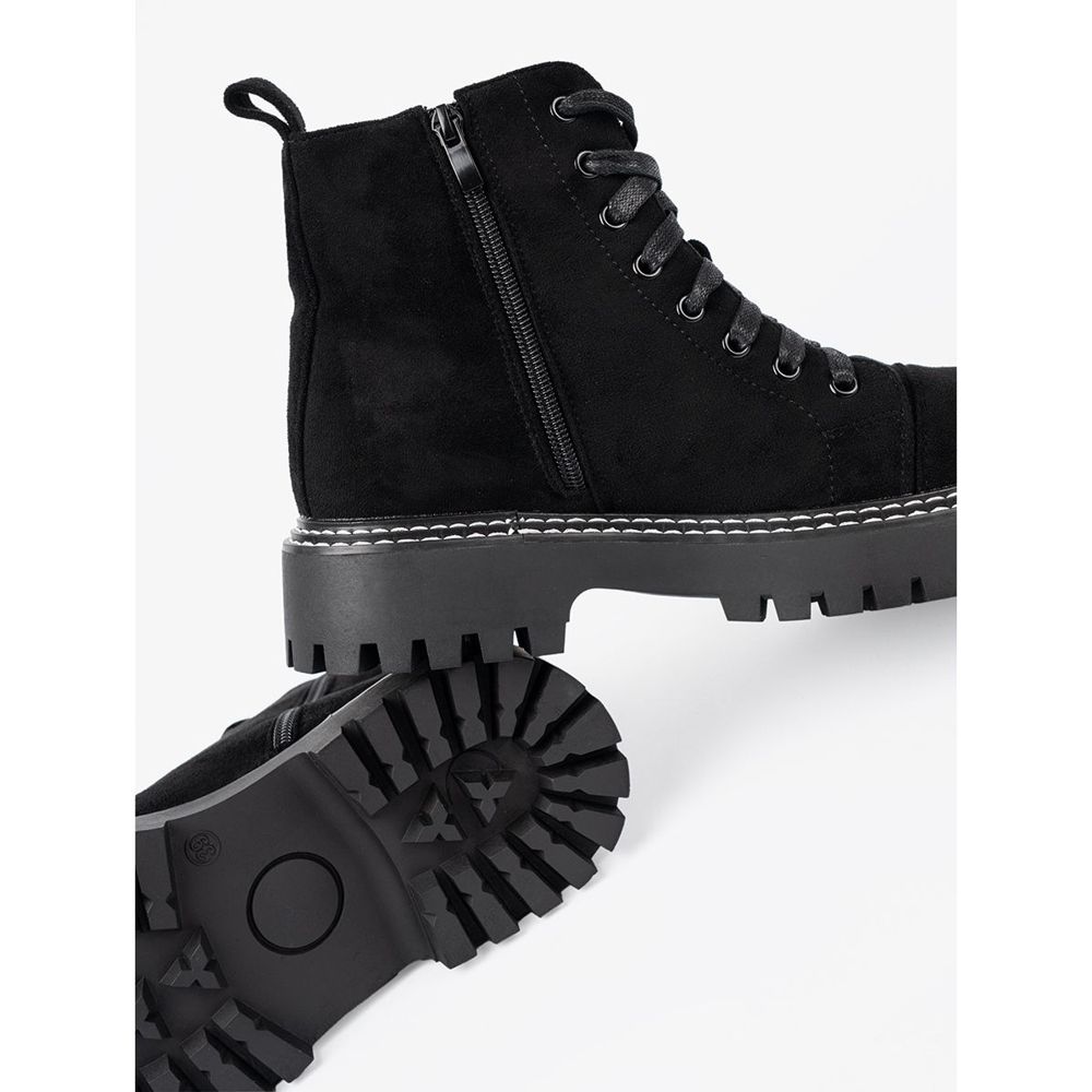 Wir präsentieren elegante schwarze Spitzen -UP -Stiefel aus der Marke Shelvt, die eine perfekte Kombination aus Stil und Komfort darstellen. Diese Stiefel mit einem glänzenden Herzen verleihen jeden Tag jeden Tag ein wenig romantisch zu jeder lässigen Stylisierung.