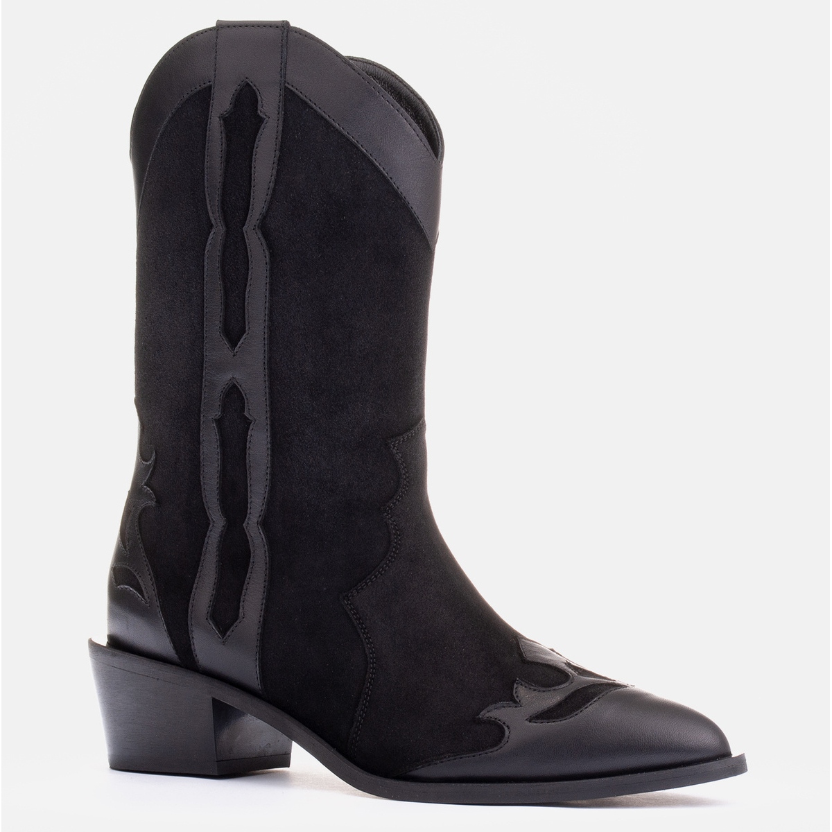 Entdecken Sie Eleganz und Cowboy-Stil mit unseren schwarzen Stiefeletten von Marco Shoes! Diese einzigartigen, bis zur Wadenmitte reichenden Cowboystiefel sind aus hochwertigem Rindssamt gefertigt, was nicht nur für Langlebigkeit, sondern auch für einen einzigartigen Look sorgt.