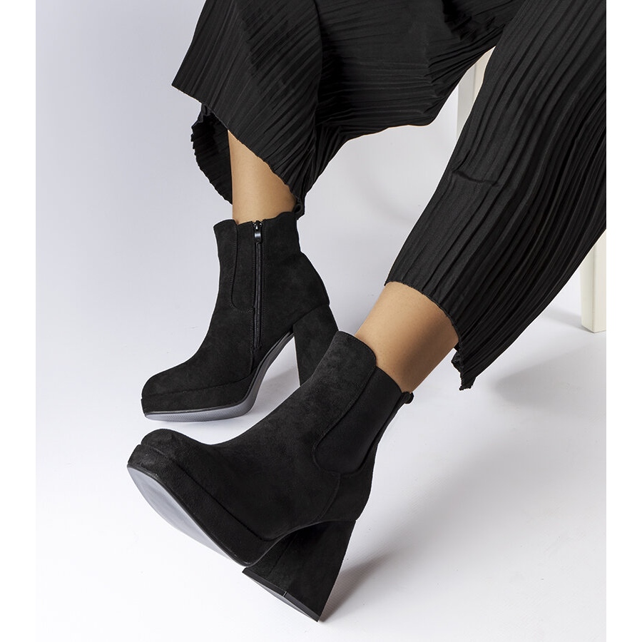 Diese Stiefel mit einem soliden 10 cm hohen Blockabsatz verlängern das Bein nicht nur optisch, sondern sorgen dank ihrer Konstruktion auch für Stabilität bei jedem Schritt. Sie sind auf Tragekomfort ausgelegt und verfügen über eine Standardnummerierung, die die Auswahl der perfekten Größe erleichtert. Die Höhe des Schuhs, der knapp über den Knöchel reicht (23 cm), verleiht Eleganz und ermöglicht harmonische Kombinationen sowohl mit Kleidern als auch mit Hosen.