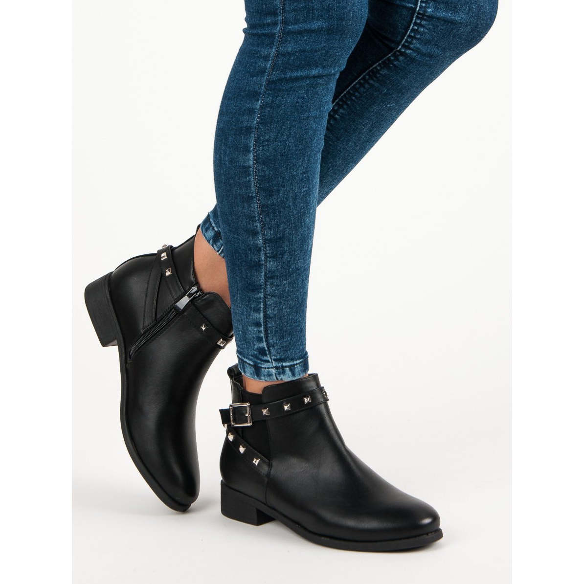 Die schwarze Farbe, die dekorative Schnalle und die Strasssteine verleihen den Stiefeln einen einzigartigen Charakter, der perfekt zu aktuellen Trends passt. Ein seitlicher Reißverschluss und elastische Bänder ermöglichen ein bequemes und schnelles An- und Ausziehen der Schuhe.