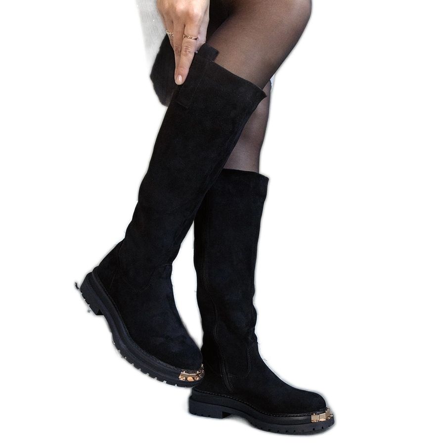 Entdecken Sie die ungewöhnlichen schwarzen Stiefel mit einem Metall-Guillor-Finish, die ein Muss in der Garderobe jeder modischen Frau sind. Diese Stiefel aus hochwertigem ökologischem Leder aus Wildleder erfreuen sich mit modernen Design und Funktionalität. Eine runde Nase und eine 4,5 -cm -Plattform tragen nicht nur zum Stil, sondern auch jeden Tag.