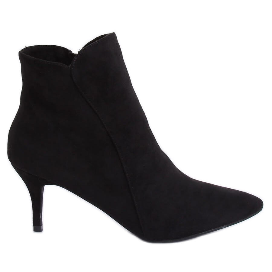 Schwarze Stiefeletten bestehen aus ökologischem Wildleder höchster Qualität und sehen dank ihres Designs mit zarten spitzen Zehen wunderschön am Bein aus. Ein niedriger, 7 cm hoher Absatz sorgt für dezente Eleganz und ermöglicht es Ihnen, bequem durch die Straßen der Stadt zu schlendern, ohne sich Gedanken über Fußermüdung machen zu müssen.