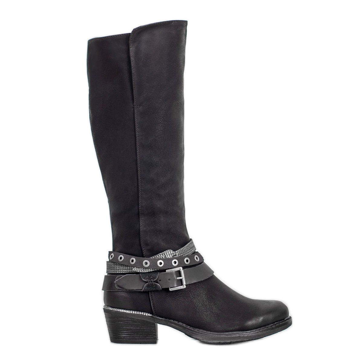 Die schwarze Farbe der Stiefel ist äußerst universell, wodurch sie sich problemlos mit vielen Styles kombinieren lassen. Verziert mit silbernen Zirkonen und Strasssteinen verleihen diese Schuhe einen einzigartigen Charakter und geben jeder Frau das Gefühl, etwas Besonderes zu sein. Zusätzliche Details wie eine dekorative Schnalle und ein Gürtel unterstreichen das elegante Design.