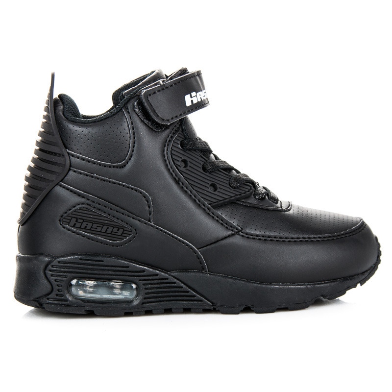 Klassische, universelle Kinderschuhe von Hasby aus hochwertigem ökologischem Leder. Das über dem Knöchel liegende Modell bietet zusätzlichen Halt für das Sprunggelenk und durch das schlichte schwarze Design eignen sich die Schuhe sowohl für den Alltag als auch für etwas formellere Styles – für Mädchen und Jungen.
