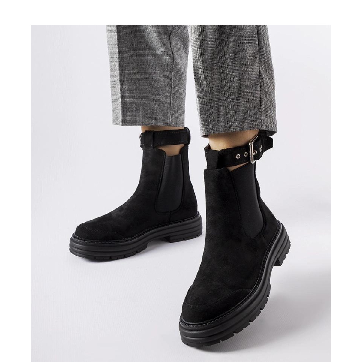 Schwarze Stiefel mit einem dekorativen Verschluss sind ein Muss in jeder Frauengarderobe. Sie bestehen aus hochwertigem ökologischem Wildlederleder und kombinieren Komfort und Haltbarkeit, was sie zu einer idealen Wahl für kühlere Tage macht. Der durchschnittliche 5 -cm -High Heel verleiht Eleganz, ohne den Komfort des Tragens dank eines runden Zehs aufzugeben, was die Geräumigkeit für die Finger gewährleistet.