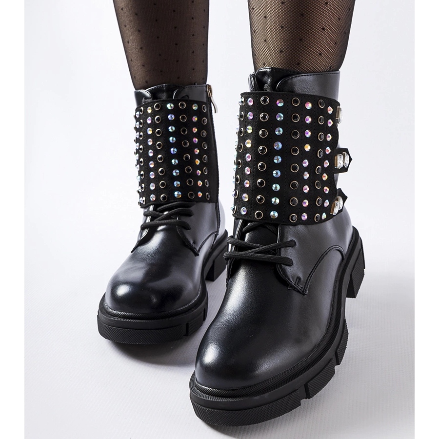 Stylische Cento -Frauenstiefel sind eine Kombination aus modernem Design und praktischer Verarbeitung. Das mit glänzende Zirkone und Strasssteine dekorierte schwarze ökologische Leder -Obermaterial verleiht den Schuhen einen eleganten, leicht felsigen Charakter, und die runde Nase und die flache Ferse sorgen für den Komfort, den ganzen Tag zu tragen.