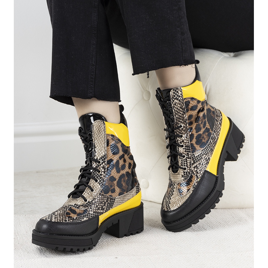 Die hohe Trappersohle, ein Hit in dieser Saison, garantiert Komfort und Stabilität auf verschiedenen Untergründen. Ein auffälliges Tiermotiv kombiniert mit ausdrucksstarken gelben Einsätzen machen diese Schuhe zu einem Must-have für jede Fashionista.