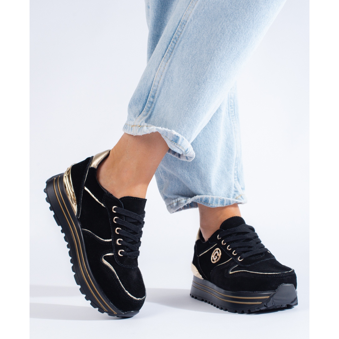 Schwarze Turnschuhe auf der Schwarz/Gold -Plattform sind die perfekte Kombination aus Komfort und modischem Design - täglich praktisch und gleichzeitig dank der Dekorationen effektiv. Wenn Sie nach universellen Turnschuhen mit Charakter suchen, erfüllt dieses Modell Ihre Erwartungen.