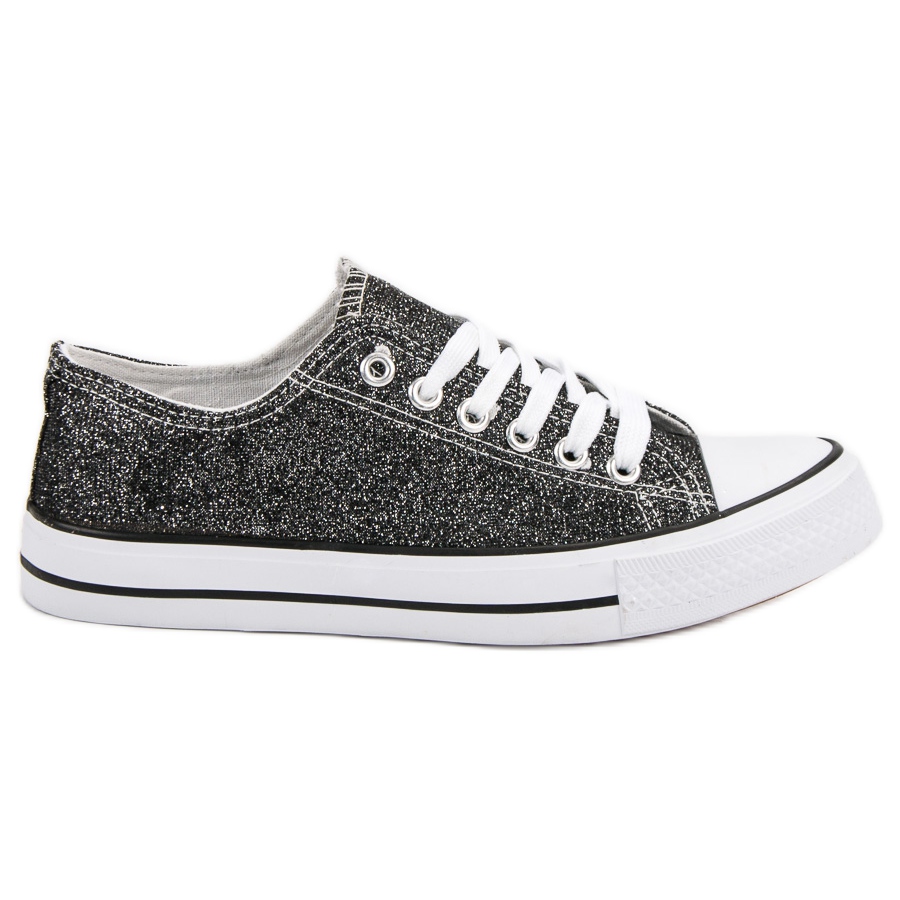 Wir präsentieren schwarze Sneakers mit Glitzer, die eine perfekte Kombination aus Klassik und Moderne darstellen. Ihr minimalistisches Design mit weißer Sohle ist elegant und der Zusatz von Glitzer sorgt für etwas Glanz und Einzigartigkeit. Dies ist ein ideales Angebot für Frauen, die ihren Alltagsstil aufpeppen möchten, ohne auf Komfort zu verzichten.