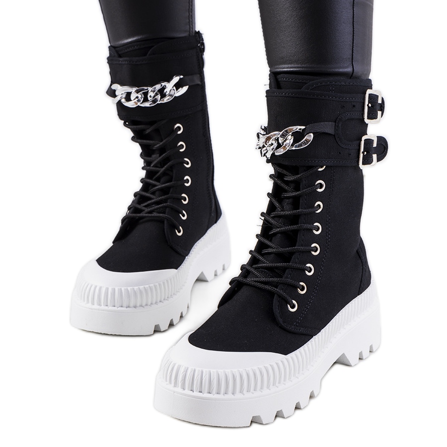 Wir präsentieren schwarze Sneaker mit Kette, Modell Taus – die perfekte Wahl für Frauen, die ihrem Styling eine modische Note verleihen möchten! Diese einzigartigen Sneaker zeichnen sich durch eine hohe Traktorsohle aus, die nicht nur Tragekomfort, sondern auch hervorragenden Grip auf verschiedenen Oberflächen gewährleistet. Der Stil der Sneakers, kombiniert mit einem eleganten, mit einer Kette verzierten Gürtel, verleiht ihnen einen originellen Charakter und macht sie zu einem untrennbaren Element Ihrer Garderobe.
