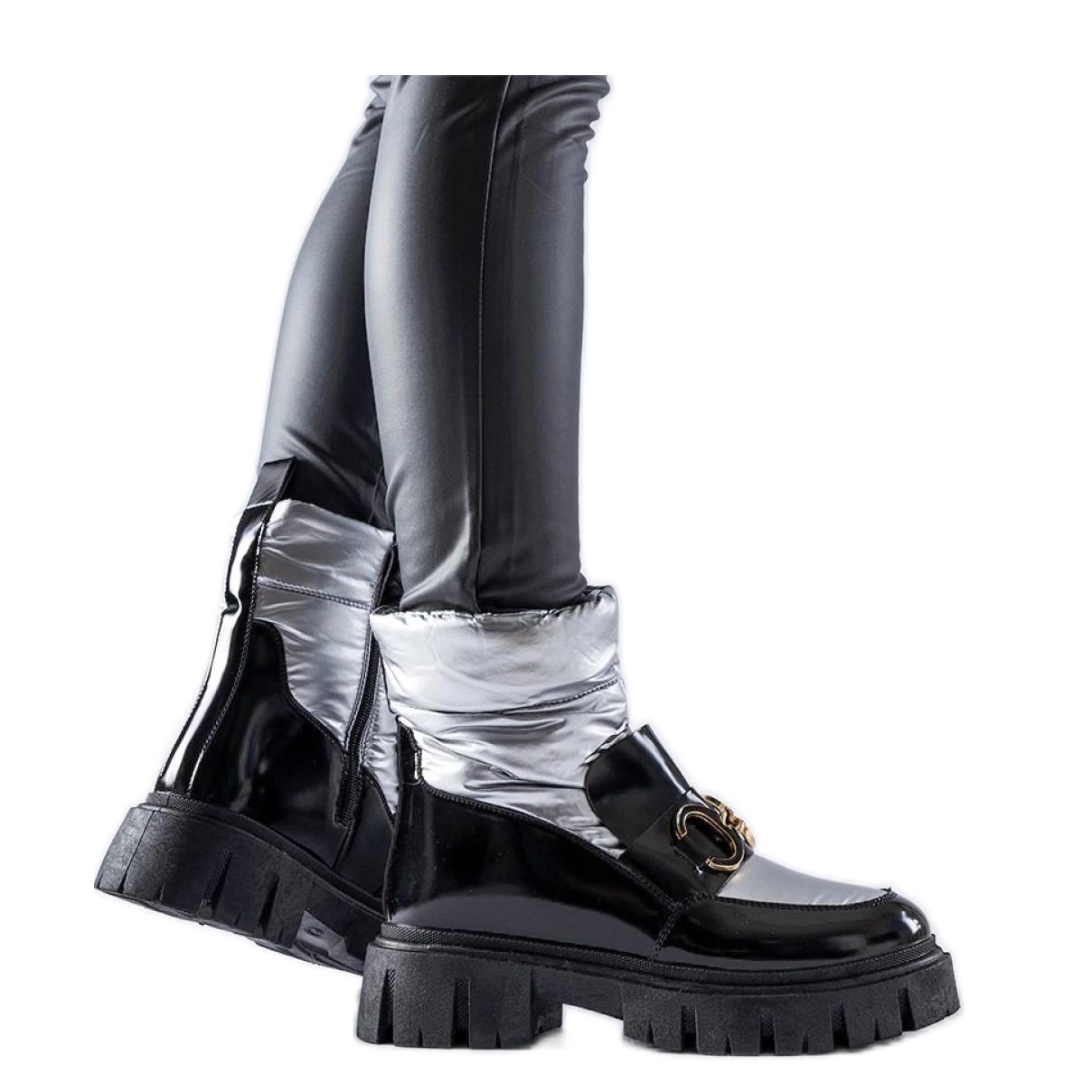 Schwarz und Silber, lackierte Schneestiefel sind die perfekte Lösung für jede Frau, die den Stil unter Winterbedingungen mit Funktionalität kombinieren möchte. Diese eleganten Knöchelschuhe zeichnen sich durch ein einzigartiges Design aus und kombinieren eine modische schwarze Farbe mit subtilen Silberakzenten.