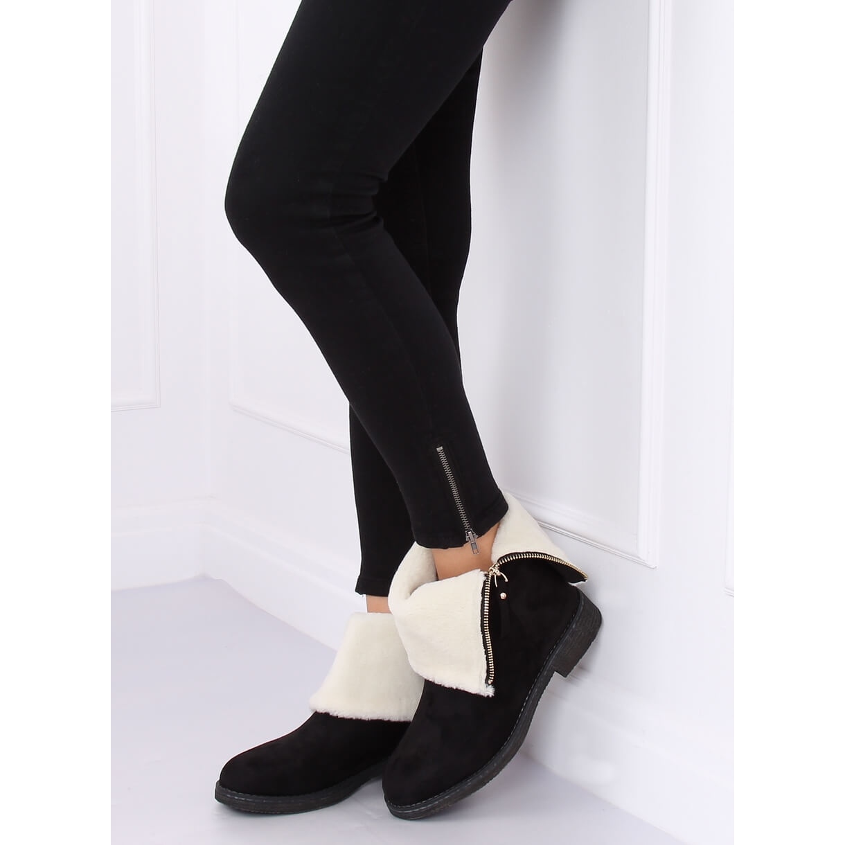 Die schwarzen Damenstiefeletten S118 sind die perfekte Wahl für frostige Tage und vereinen Stil und Komfort. Diese isolierten Stiefeletten aus ökologischem Wildleder in elegantem Schwarz werden mit ihrem originellen Design sicherlich alle Blicke auf sich ziehen. Ein stilvoller goldener Reißverschluss und aus dem Obermaterial hervorstehendes Fell verleihen den Schuhen nicht nur Charakter, sondern sorgen auch für zusätzliche Wärme.